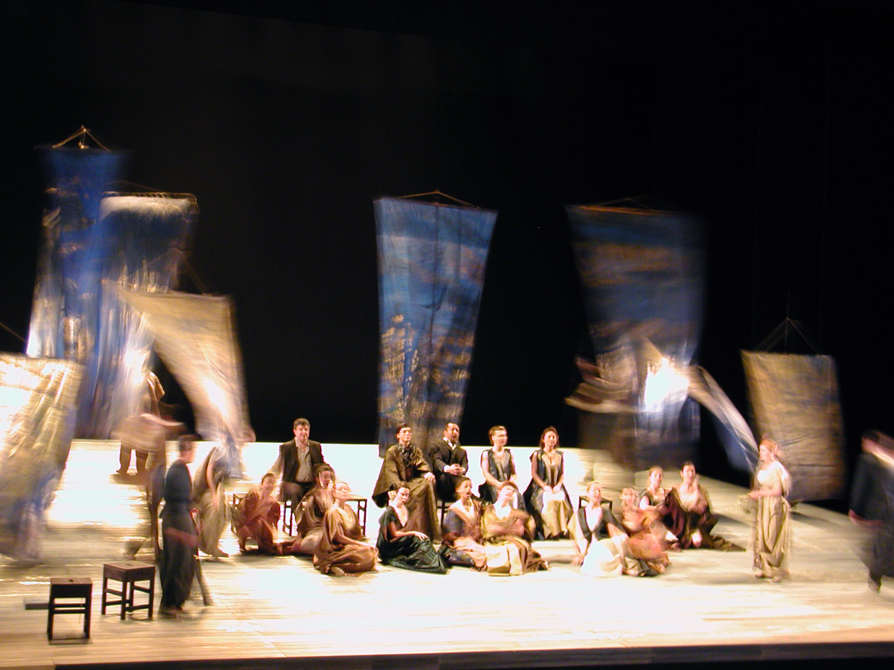 Jean-François Sivadier signe aussi le décor avec Virginie Gervaise : superbe ! Des mâts avec des voiles, bleu et or, légers, mobiles. Ils structurent le vaste plateau, permet- tent la fluidité, sont à la fois paysages, parois de la mai- son, voiles des navires, nuit intime ou… cerisiers que l’on dépouille de leurs « fleurs ». Il suffit d’arracher les voiles et il ne reste que des mâts nus comme des gibets sur une plaine désolée, prélude à la mort de l’héroïne. Tout l’opéra est truffé de ces images fortes, en multiples sens qui nais- sent par le tournoiement et par la lumière, très subtile, de Philippe Berthomé.