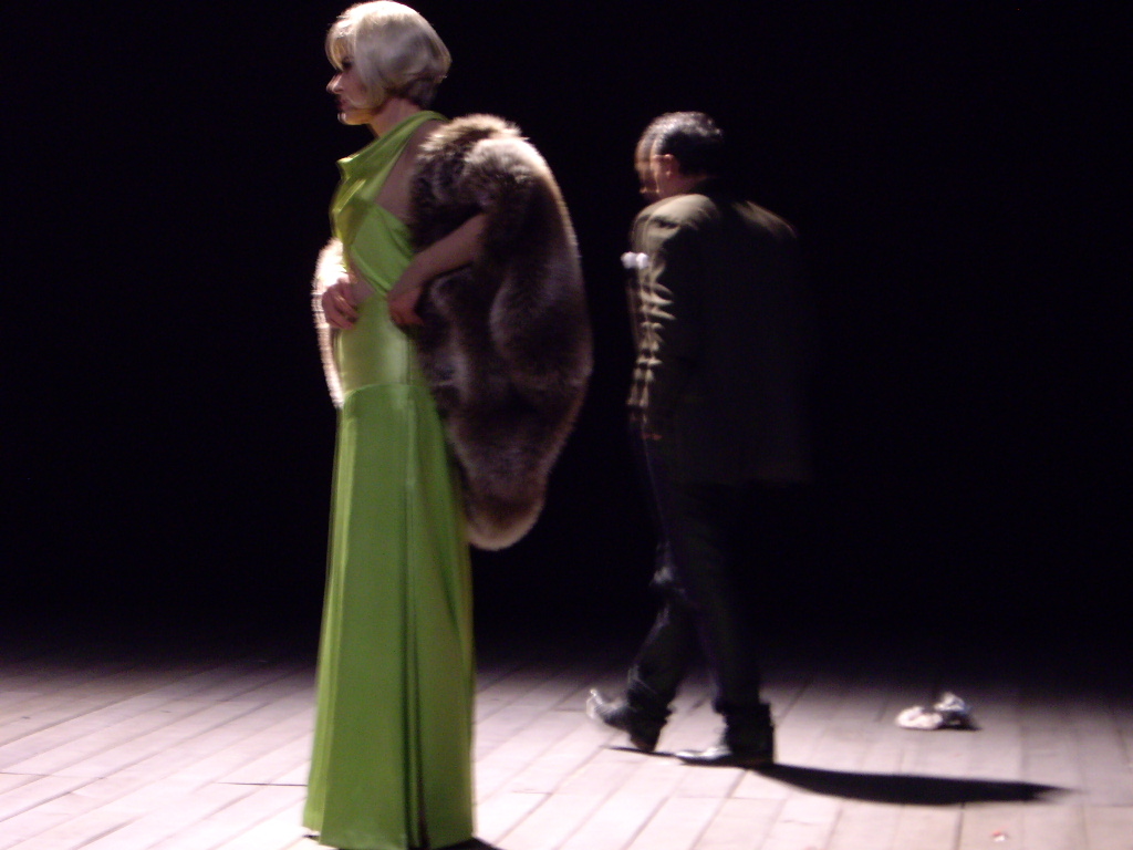 Ce qui compte ici, au travers de cette figure de personnage combattant flanquée de ses deux danseurs-chanteurs, filiformes comme de vrais boys (excellents Eric Guérin et Francis Leplay) dans leurs costumes de bric et de broc un peu défraichis (Virginie Gervaise), c’est que la vie de la fille, c’est l’absolu de la scène. Sa vie de salle miteuse en salle sinistre, escortée de son seul bien, un tabouret de bois, et enveloppée de sa seule richesse, une robe du soir, une robe de star d’un vert délicat, entre l’anis et le Nil, épaules sous une étole de fourrure, sa vie, c’est la vie d’artiste.
