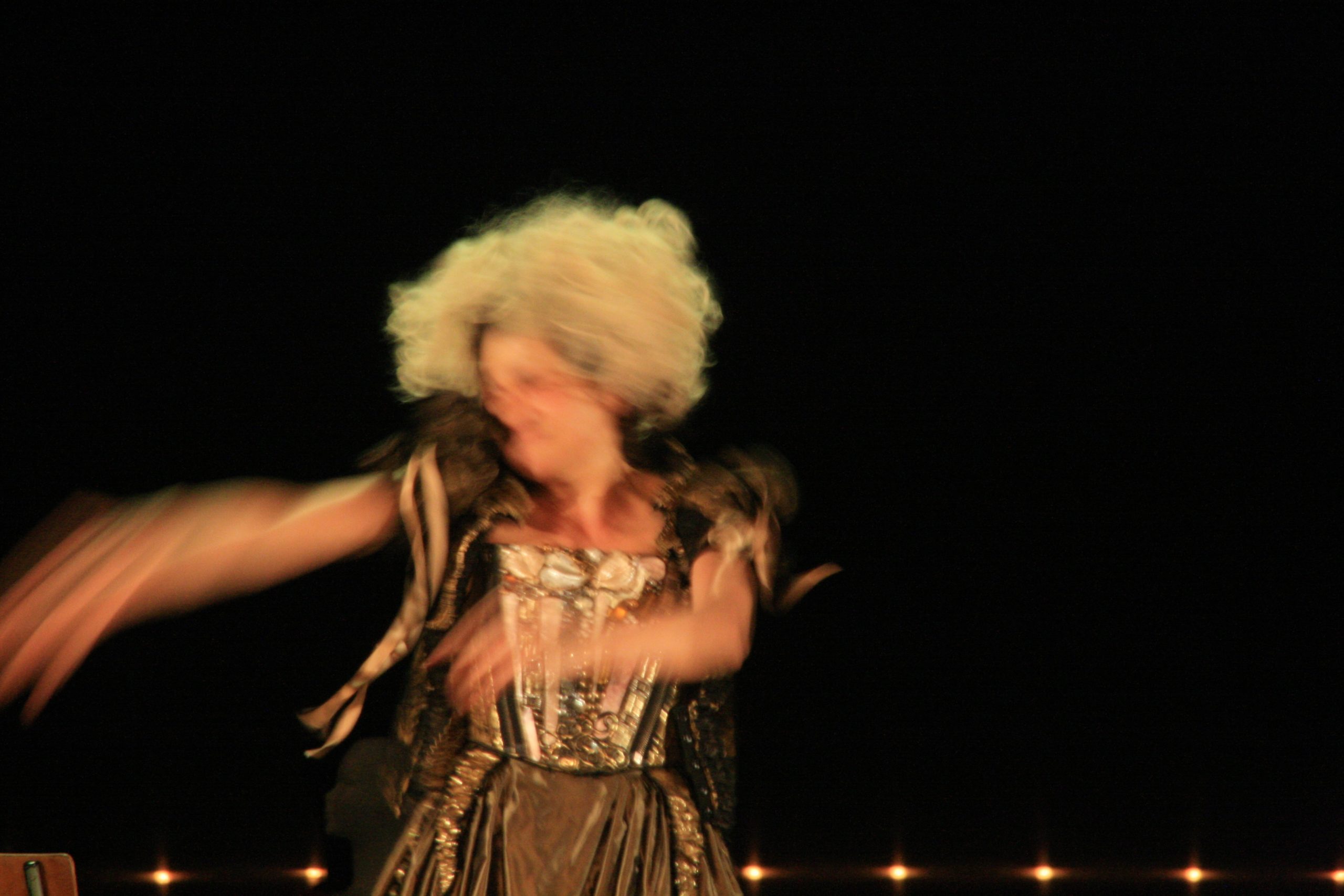 … Elvire – Marie Vialle – fait une entrée remarquée, remontant de la salle, elle porte la coiffe à plumes des indiens navajos et, guerrière, semble déterrer la hache de guerre, attendant Dom Juan de pied ferme …